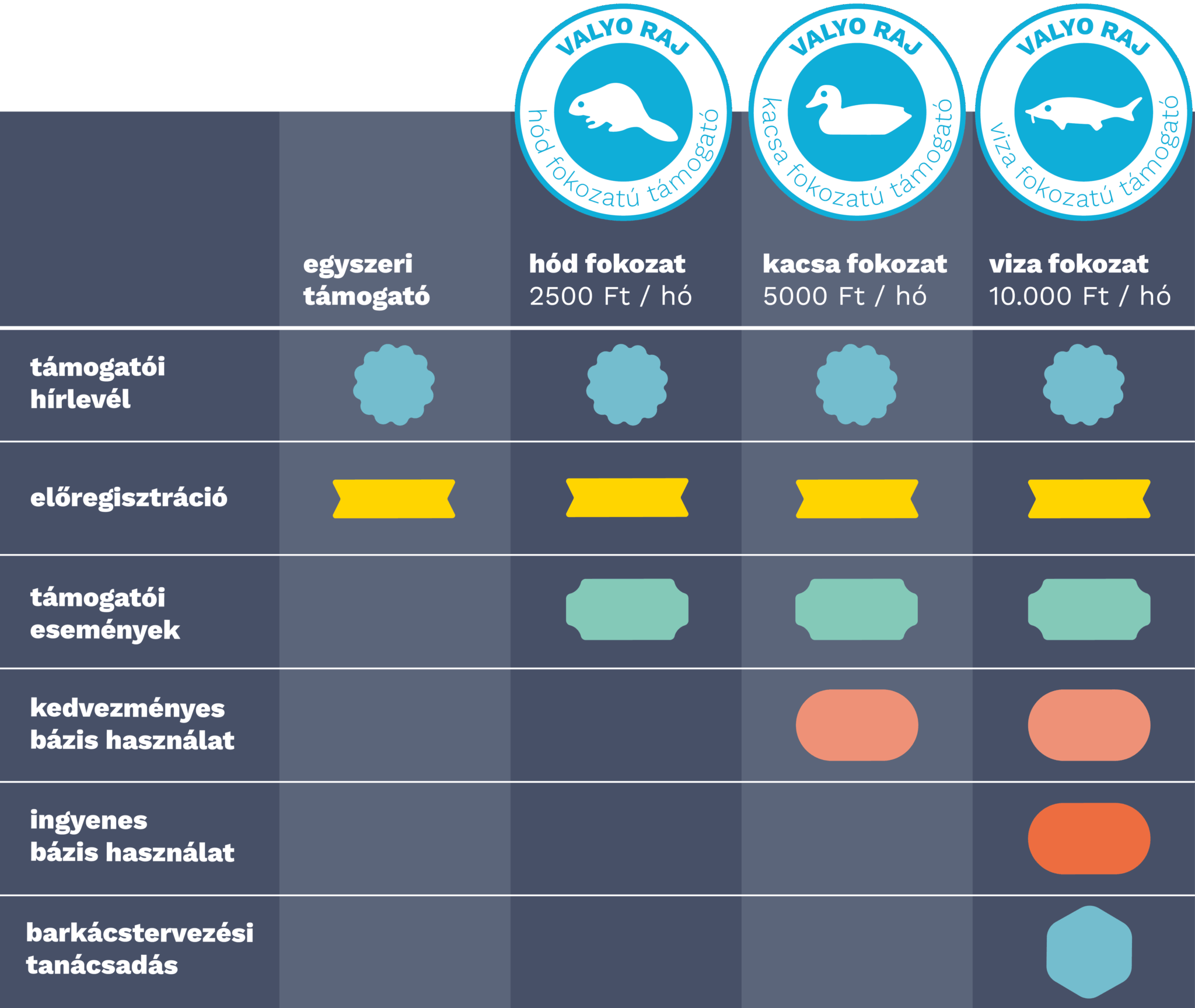 Részvételi lehetőség a támogatói eseményeken: évente több támogatói eseményt szervezünk, amelyeken a Valyo RAJ hód, kacsa és viza fokozatú tagjai megismerkedhetnek a csapattal és betekintést nyerhetnek a Valyo munkájába. Mindezt persze a Valyótól jól megszokott formában: Duna-parton, köztéren, kötetlenül, közösségben.